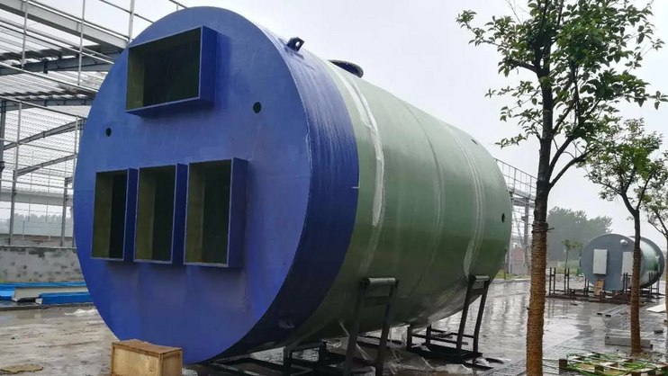 一体化预制泵站筒体采用无碱玻璃纤维无捻粗纱及其制品为增强材料,热固性树脂为基体,计算机缠绕工艺,厚度均匀巴氏硬度达到40hba及以上,抗压强度120MPa及以上,周向抗拉强度150MPa,轴向抗拉强度60MPa